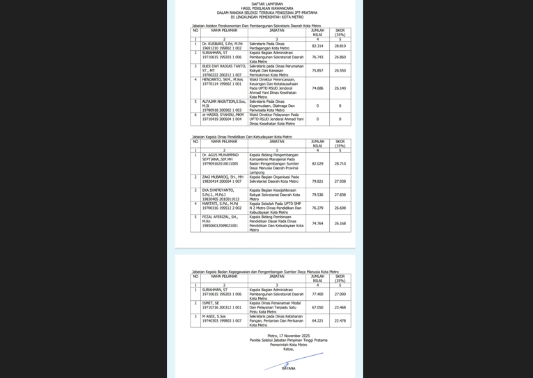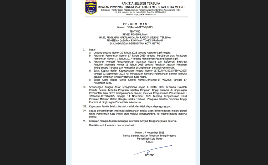 Pengumuman tersebut ditandatangi langsung oleh Pansel JPTP yang juga Pelaksana Tugas (Plt) Sekretaris Daerah (Sekda) Kota Metro, Bayana tertanggal 17 November 2025.